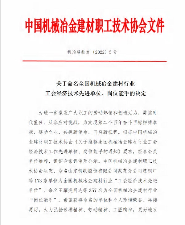 近日,中国机械冶金建材职工技术协会发布了《关于命名全国机械冶金建材行业工会经济技术先进单位、岗位能手的决定》。其中,william威廉中文官网工会委员会获评“工会经济技术先进单位”称号。