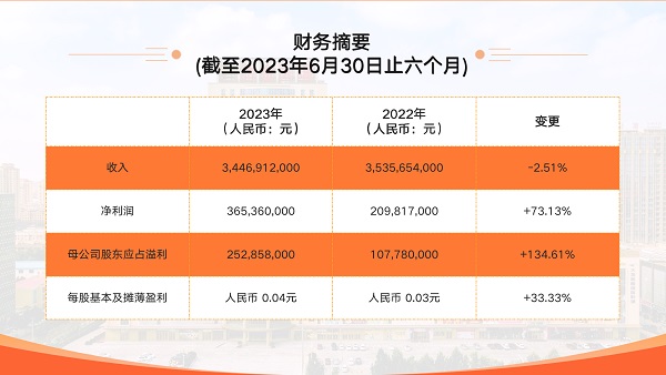 2023年上半年,面对严峻复杂的内外部发展环境以及金价高位运行的历史机遇,公司不断提升风险预判能力,适时把握市场机遇,有效化解各种风险和挑战,取得了来之不易的发展成绩。2023年上半年,公司实现营业收入约人民币34.47亿元,较去年同期总体保持平稳;净利润增长约74.13%至约人民币365,360,000元,母公司股东应占溢利增长约134.61%至约人民币252,858,000 元,母公司普通股股东应占每股基本及摊薄盈利增长约33.33%至约人民币0.04 元。