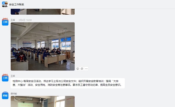 钉钉平台紧“盯”安全生产动态。建立钉钉“安全工作联系群”,群成员包括经营层、各单位负责人及安全管理员。群内每日普及安全生产法律法规知识、提醒安全注意事项、传达上级安全生产文件、发布单位安全工作动态、交流安全工作经验等,以方便安全管理工作人员联络沟通。钉钉工作群的上线使用,使各单位开展的安全教育活动、安全工作亮点第一时间在群内“亮相”,营造了崇尚安全、遵守安全的工作氛围,有效提升了企业本质安全水平。