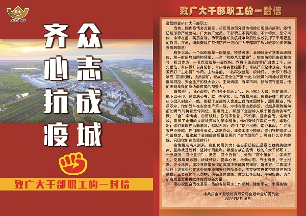 党委引领,防疫生产双保障。面对当前的疫情形势,金翅岭金矿党委第一时间召开紧急会议传达上级会议精神,全力落实疫情防控的各项要求。党政负责人靠前指挥,带头值守,确保疫情防控和安全生产“双保障”。3月18日,金翅岭金矿党委及时发布《致广大干部职工的一封信》、《致广大干部职工家属的一封信》,号召全体党员干部提高政治站位,充分发挥党支部战斗堡垒作用和党员先锋模范作用,“疫”无反顾、共克时艰,全力做好疫情期间安全生产工作,确保全年工作目标任务圆满完成。