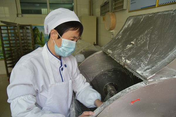 “起五更”人们常用来形容勤劳的人起得早,在金翅岭金矿食堂,有这样一群人每天起床在四更。李晓梅就是这群人中的一员,当人们还在睡梦中,金翅岭金矿食堂的灯已经悄然开启,李晓梅已经换好了工作服,站在工作台前,开始为疫情期间封闭管理的500多名留矿职工准备早餐。揉面、烙饼、煮粥、炸油条……一天的忙碌开始了。 她是金翅岭金矿食堂面案组组长。一张几平米的操作台,一台压面机、数不清的托盘……在这个岗位上,李晓梅一干就是20年,坚持源于热爱,她常说:“喜欢才能做出好东西!”