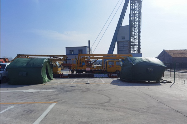 防疫安全有保障。为保证外来快递文件接收点快速施工完成并兼顾实用性和耐用性,采用野战帐篷作为快递文件接收点。同时,配备消防沙、消防锹、消防水桶及2具8KG水基灭火器,移动式紫外线消毒灯1个、床两张、桌子一张、防疫消杀器具一组,并配备冷藏柜方便易变质食品的冷藏保存。安装高清监控摄像头两处,同时安装实时监控系统并与矿山综合调度中心监控系统联网。