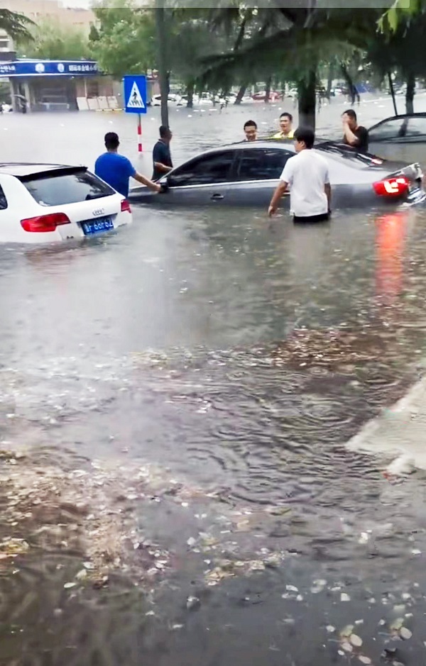 2022年6月28日,招远市突降暴雨,造成境内部分地势低的道路水位暴涨,位于魁星路与初山路交界路口南处水位上涨势头攀升,途径此行人或车辆多数绕道而行。此时正值接送孩子放学高峰,某女士接完孙子,开车途经此处,心怀侥幸地认为所驾车辆动力十足,冲过低洼积水不成问题。不料,行驶过程中车辆突然熄火,抛锚在低洼道路中心处,此时,天公不作美,又一阵大雨倾盆而下,雨水持续上涨,二人无法开启车门,被困车内,顿时身陷险境。