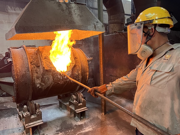 炉台上,火焰和鼓风机发出轰鸣声,在旋转减速机之下,高温熔体在镫罐中不断翻滚,一阵阵热浪随之喷涌而出。2号转炉前岗位工于永波全副武装手执工具引流,滚烫的熔体把他的脸烤得通红,汗珠顺着他的面颊和脖颈不断流淌。老于在这个岗位上一干就是十多年。“冶炼工工作非常辛苦,劳动强度也大,最难熬的也是夏天,由于火法作业药剂价格较高,工作中经常是水顾不上喝,就怕耽误时间进度造成材料浪费。但是我觉得干一行就要爱一行,只要我还干得动,我就会一直坚守下去。”于永波说。