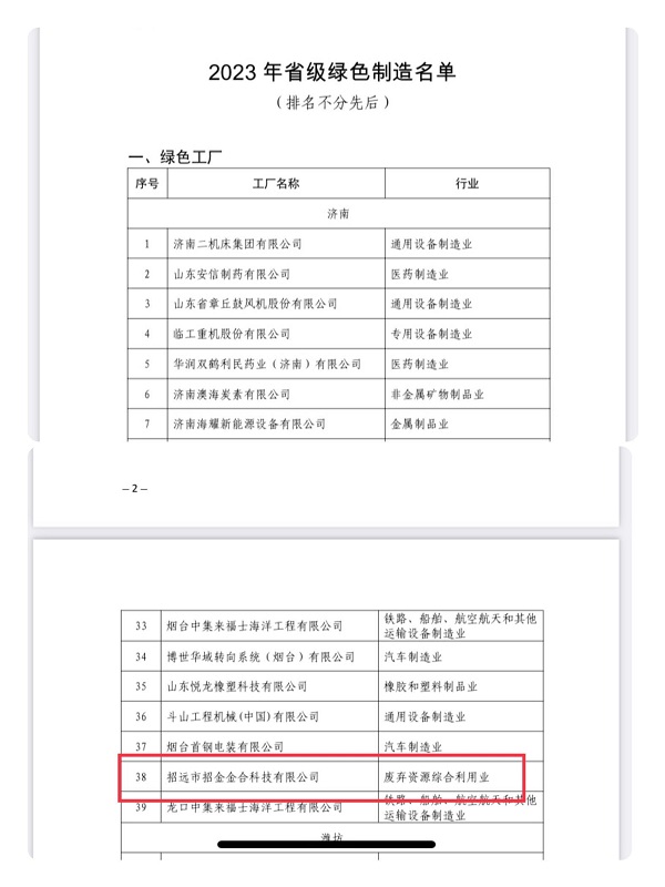 日前,山东省工业和信息化厅公布了2023年(第一批)省级绿色制造名单,william威廉中文官网金合凭借在绿色发展领域的突出表现和成效,获评“山东省绿色工厂”称号。