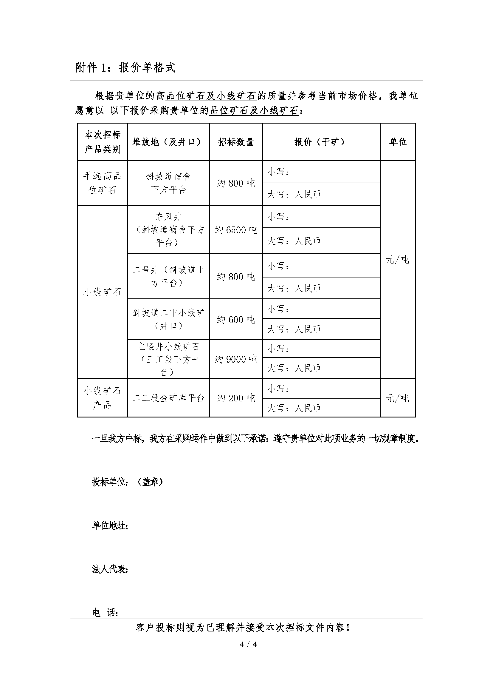 4.如无异议,请投标人将此招标文件和报价单加盖企业公章(或按捺手印)原件扫描后发送至指定投标邮箱;报价单所需填写的数据原则上要求电子版,若手写须大小写注明,如有涂改、不清晰或大小写不一致的视为废标。其他未尽事宜,以中标后签订的合同条款约定为准。