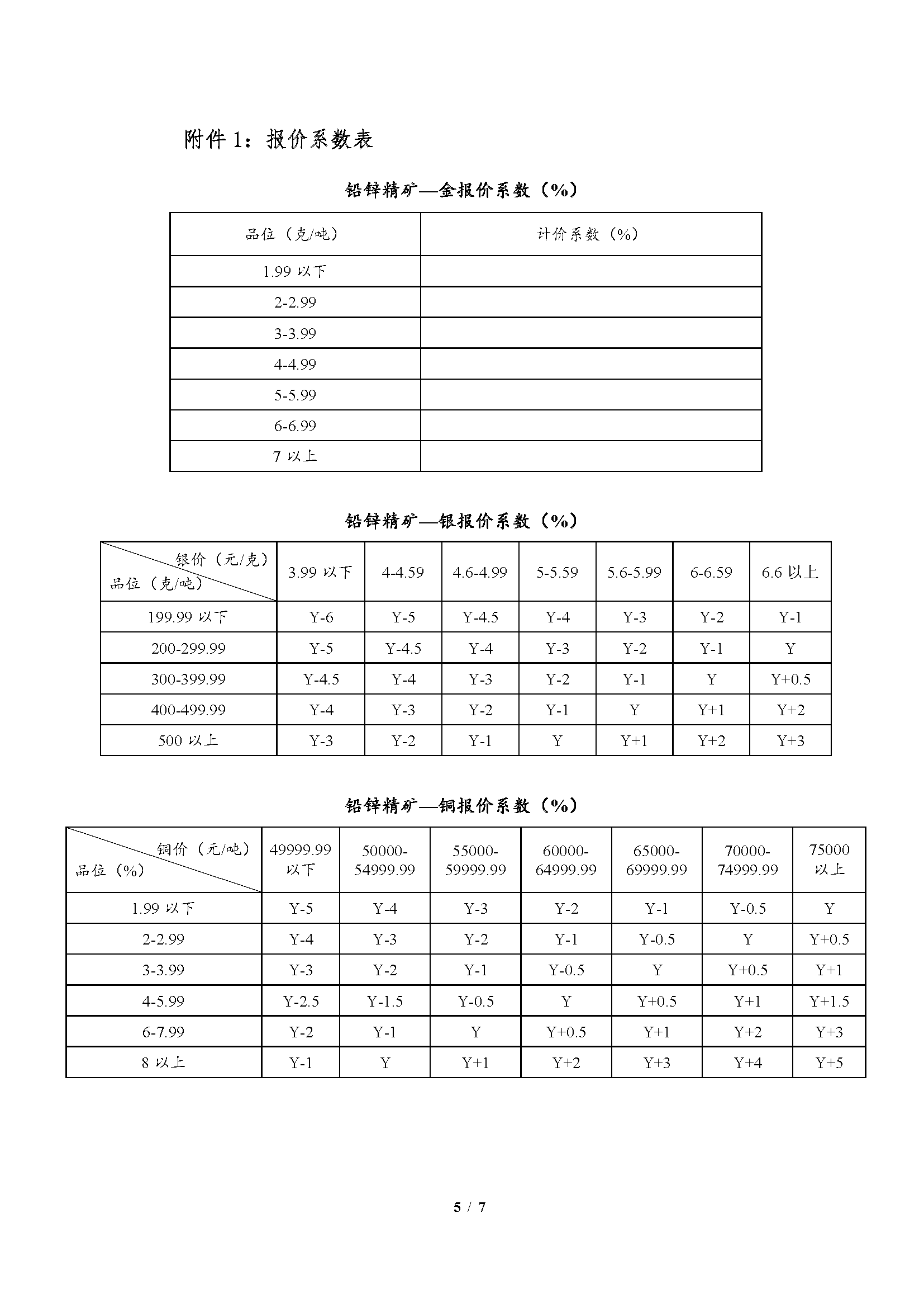 2.本次招标为一次性报价,在标书报送截止后现场制定底标并在规定时间内进行开标。本次招标以我单位检测的本批次矿各元素平均品位对应的报价系数测算出综合单价,每干吨矿计算的价值最高者得。
