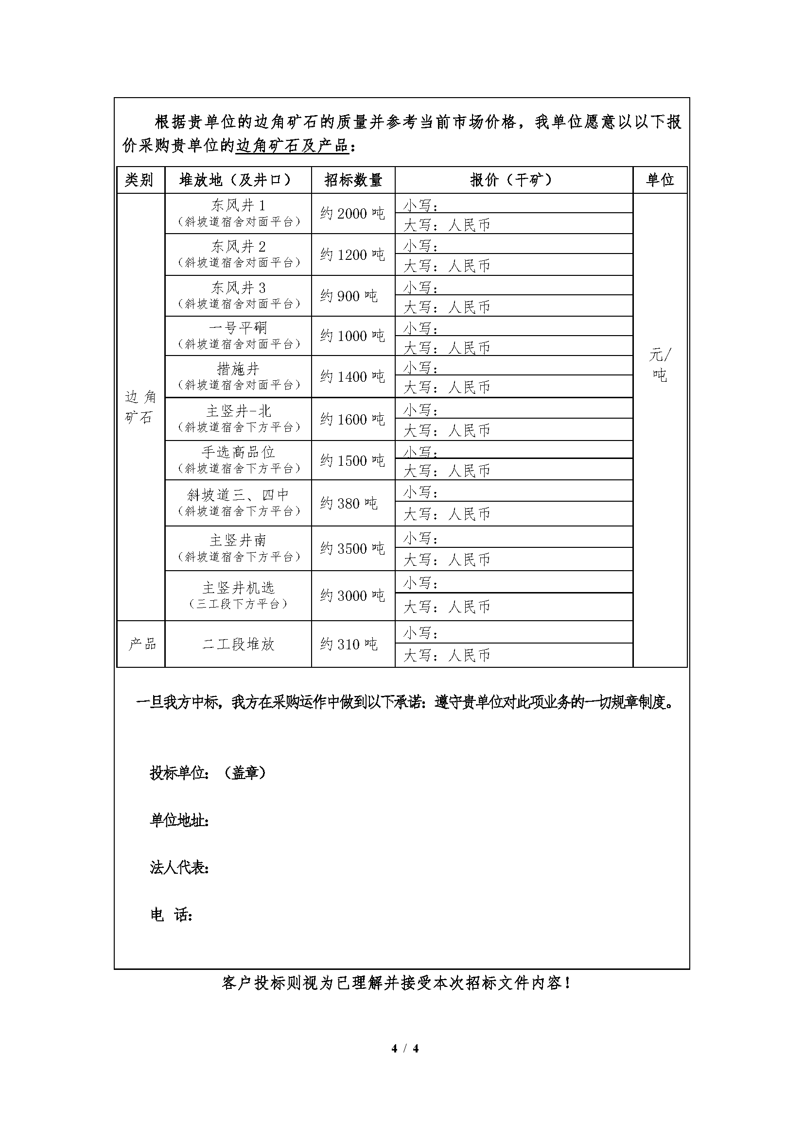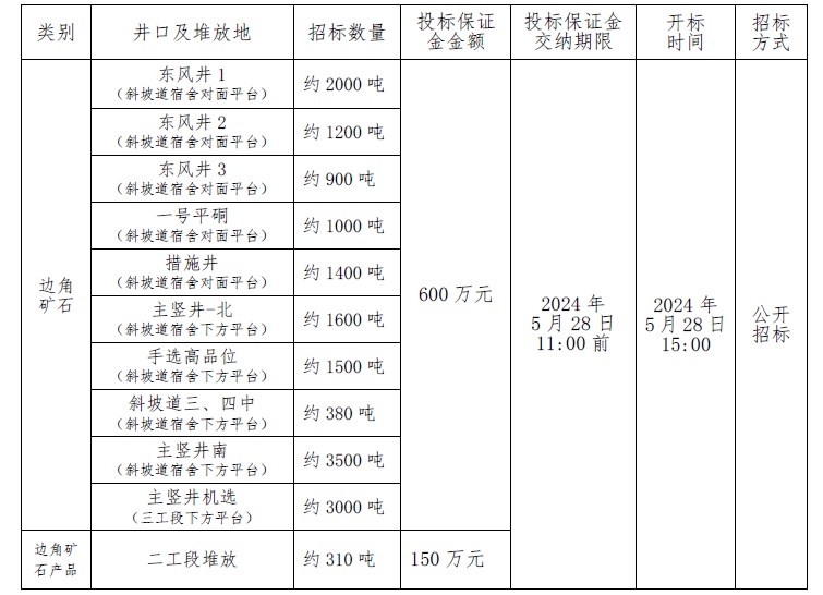 注:本次招标产品数量为预估数,投标按干矿报价,中标结算湿矿以实际过磅数为准,水分按2%扣除计算干矿;边角矿石产品水分由中标人及我公司相关科室、车间人员现场取样、我公司化验的水分数据为准。如中标人需要,我公司开具甘肃省增值税普通发票(黄金)。